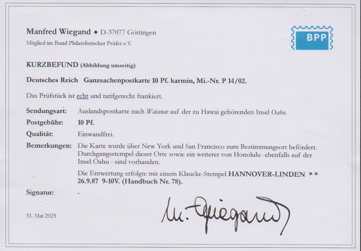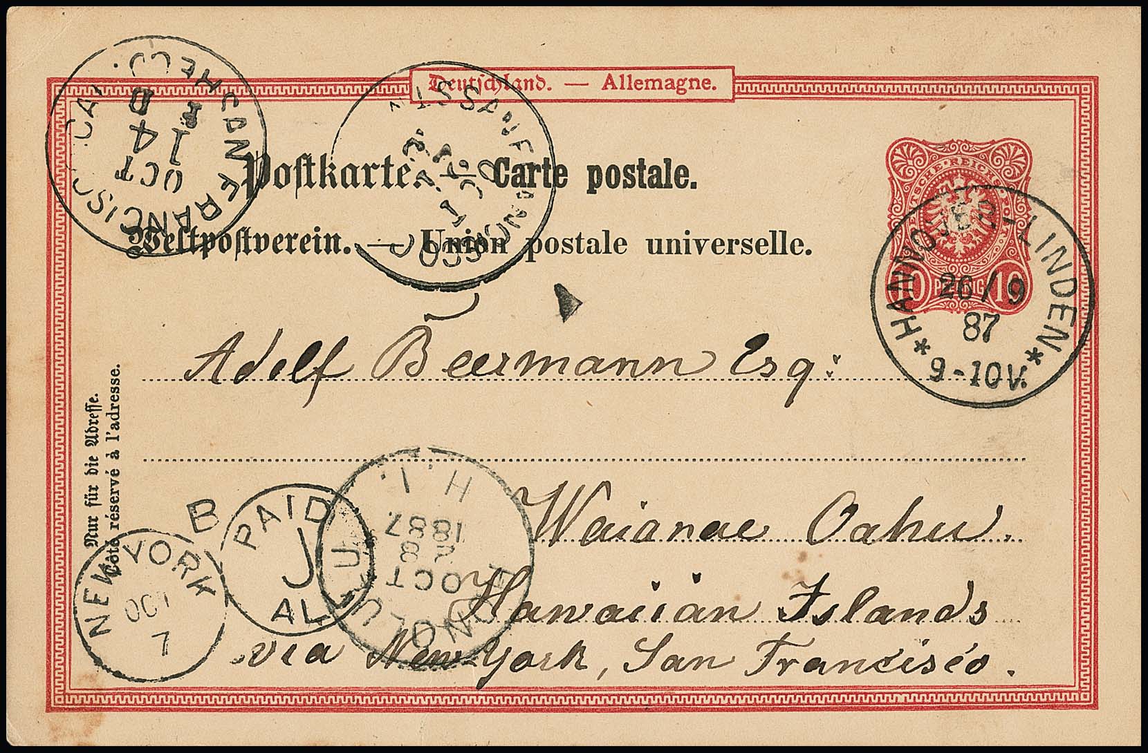 Ganzsachenkarte 10 Pfg. 1887 von Hannover-Linden nach Waianae auf der zu Hawaii gehörenden Insel Oahu, gelaufen via San Francisco und Honululu. Mit dieser Destination auf eine so entlegene Insel wahrscheinlich Unikat. Fotoexp. Wiegand