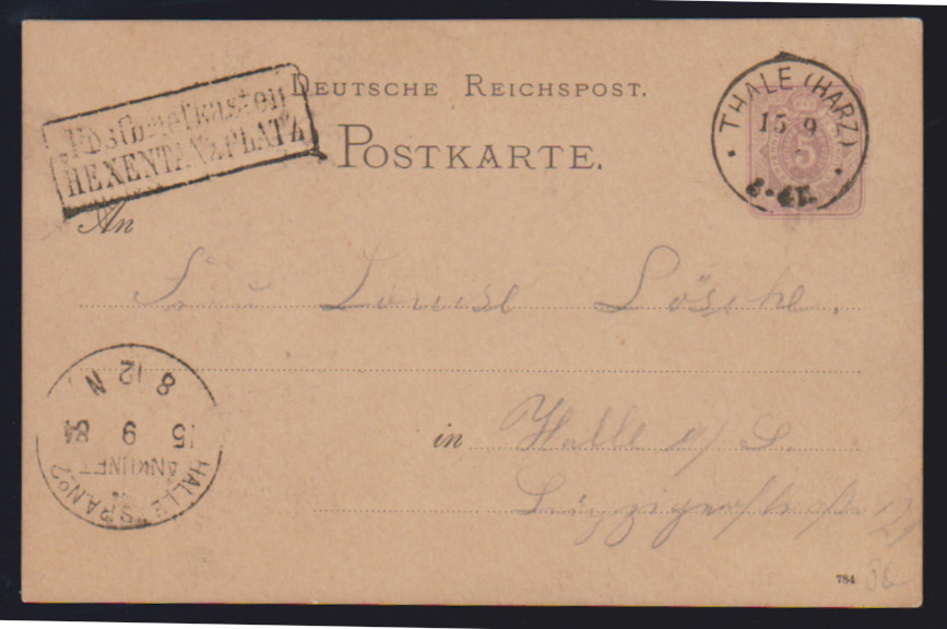 1884, Ansichtskarten-Vorläufer, Ganzsachenkarte 5 Pfg. graupurpur gebraucht mit K1 "Thale/Harz", Ra2 "Postbriefkasten Hexentanzplatz" und Ansicht "Hexentanzplatz und Hotel"