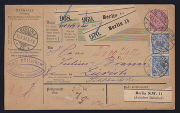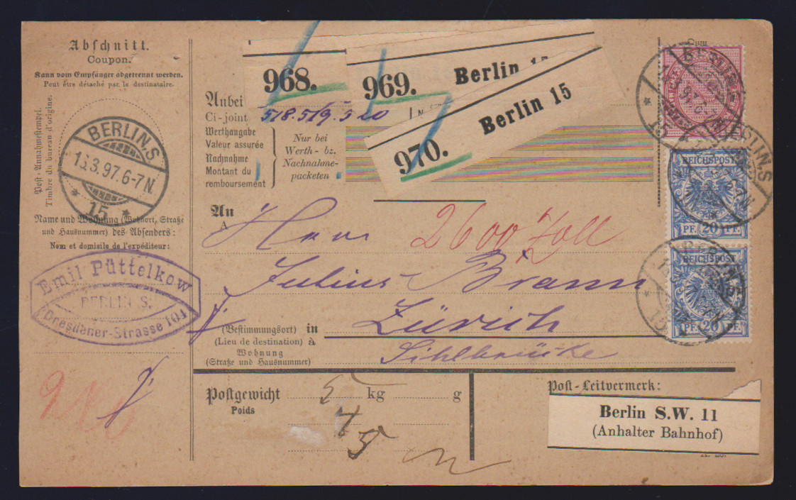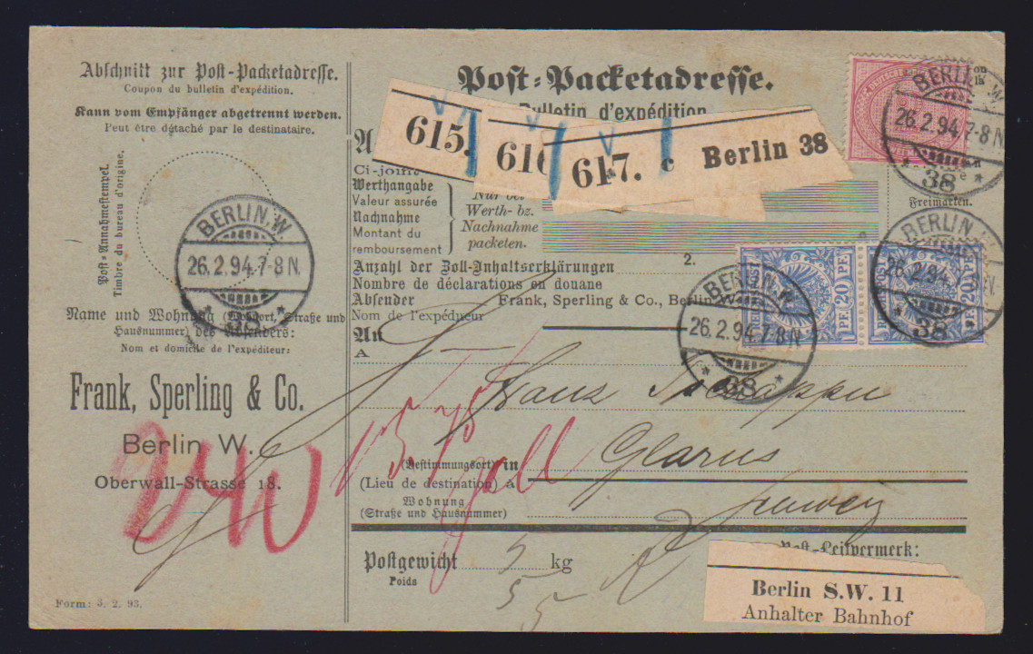 2 Mk. braunpurpur (einmal 1894 in heller Nuance wie 37f) jeweils nebst Paaren 20 Pfge. auf zwei Auslands-Paketkarten 1894/97 von Berlin in die Schweiz