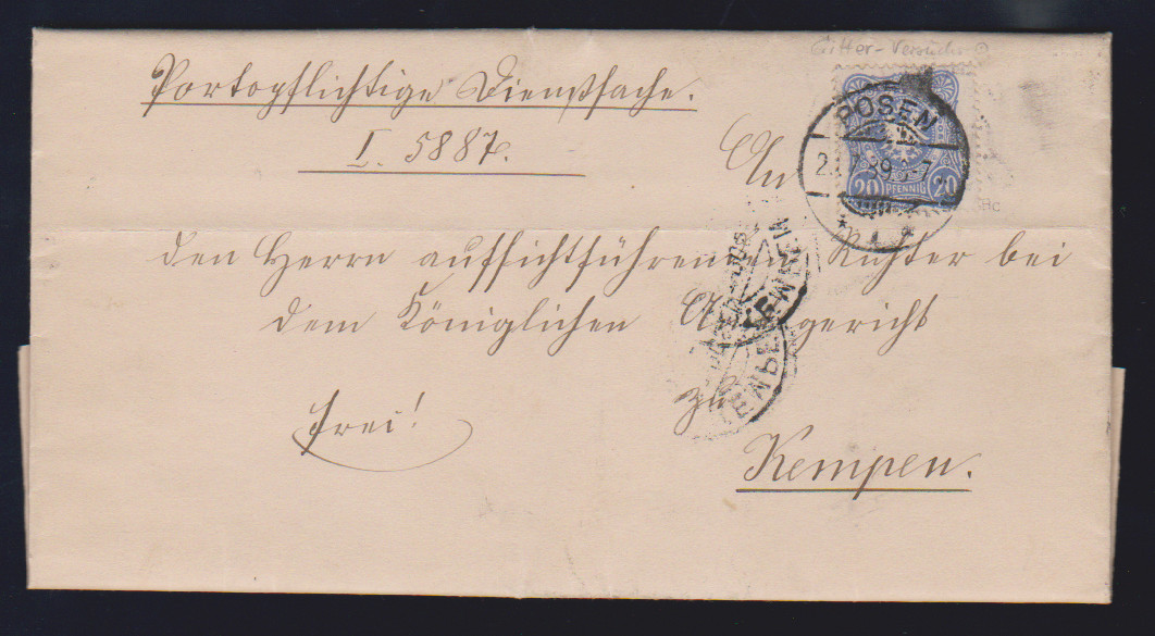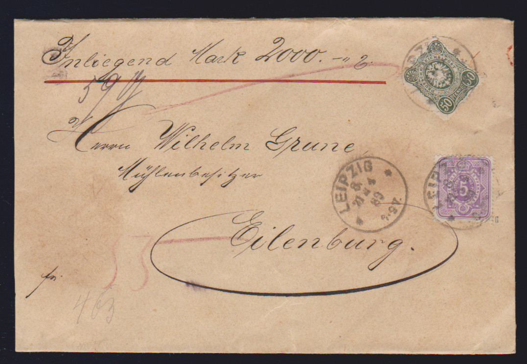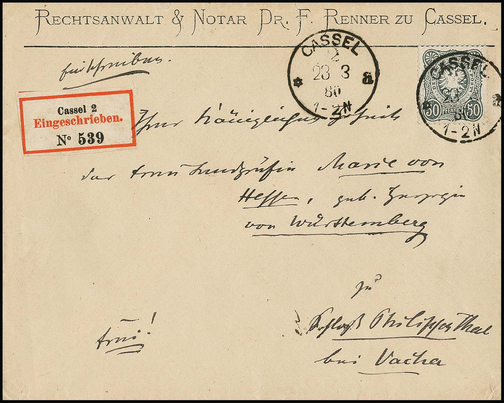 50 Pfge. olivgrün einzeln auf Einschreibebrief von Cassel 1880 an "Ihre königliche Hoheit die Frau Landgräfin Marie von Hessen, geb. Herzogin von Württemberg" auf Schloß Philipsthal, offensichtlich auch ohne besonderen Hinweis der Rückschein mitfrankiert
