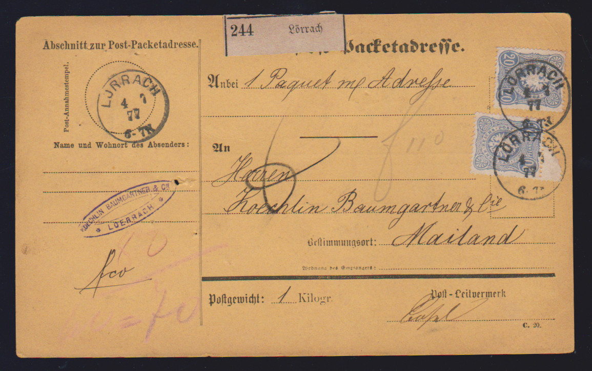 50 Pfge. olivgrün im Paar rückseitig, vs. zweimal 20 Pfge. blau, auf kpl. Paketkarte von Lörrach 1877 nach Mailand, sign. Wiegand. Mi. 350,- +