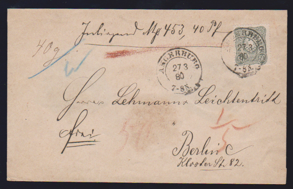 50 Pfge. olivgrün einzeln auf Wertcouvert mit K2 "Angerburg" 1880 nach Berlin