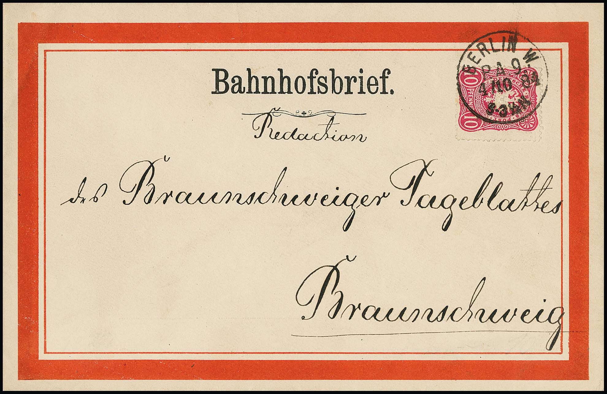 10 Pfg. rosa einzeln auf "Bahnhofsbrief" von Berlin 1884 nach Braunschweig