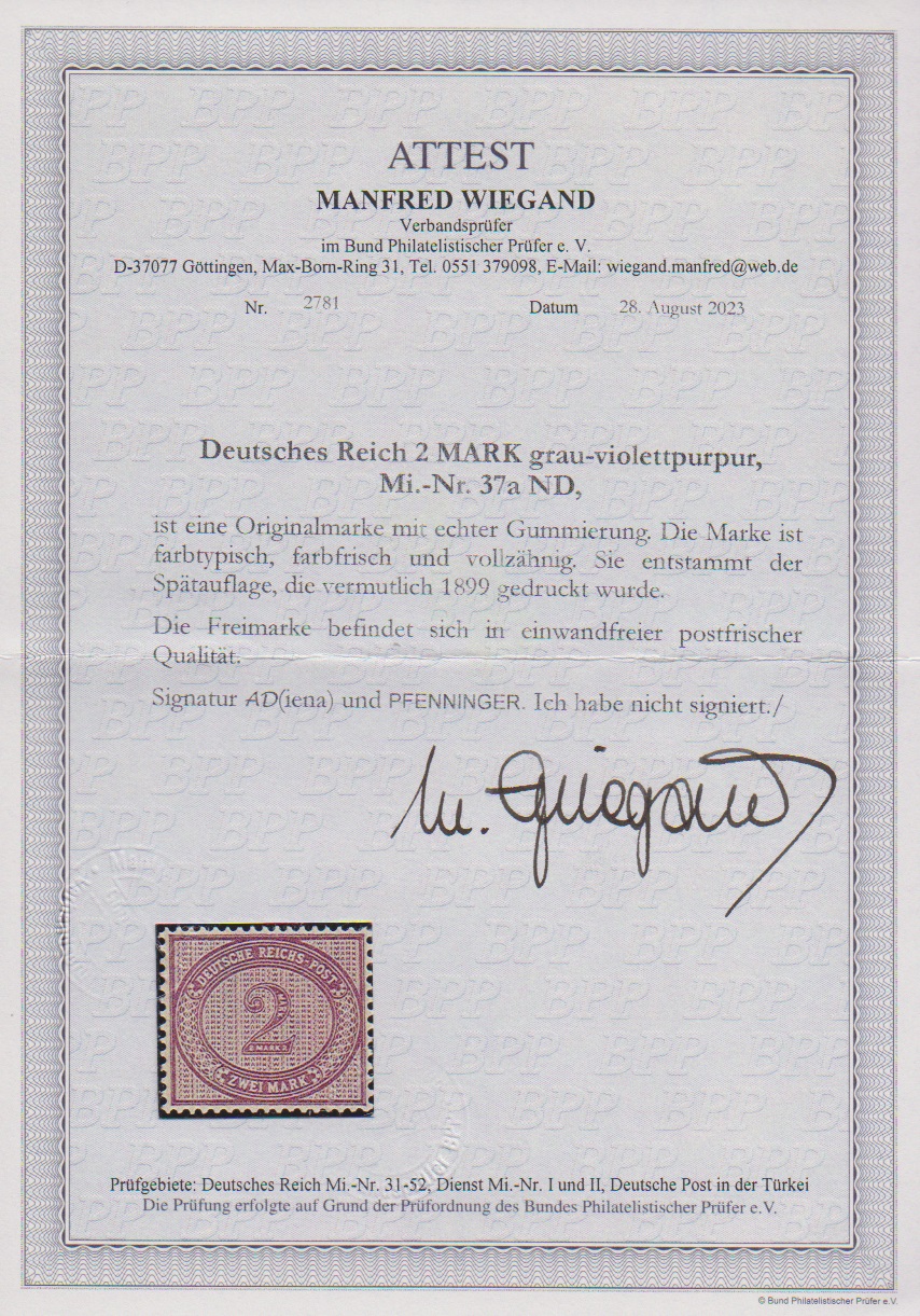 2 Mk. violettpurpur, der Neudruck von 1899 für Kosack tadellos postfrisch, sign. Pfenninger und Attest Wiegand. Mi. 1200,-