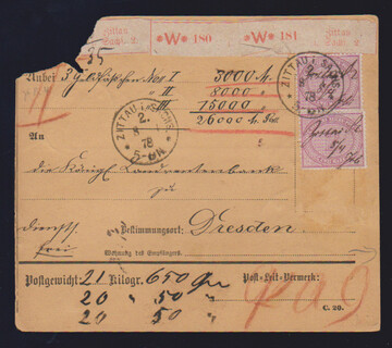 2 Mk. violettpurpur per zwei vorderseitig, einmal mit Doppelentwertung durch K1 und hs., nebst rs. 5 Pfge. purpur und Dreierstreifen 50 Pfge. gräulichgrün, auf Inlands-Wertpaketkarte (typischer kleiner Ausriß) von Zittau nach Dresden