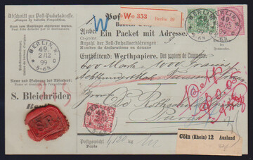 2 Mk. lilakarmin, nebst 5 und 10 Pfg., auf ungefalteter Auslands-Paketkarte 1899 von Berlin 49 nach Paris