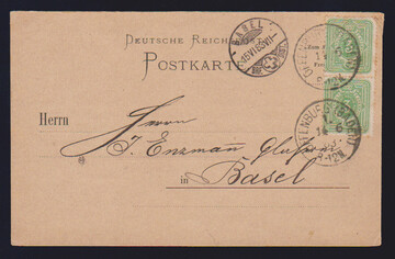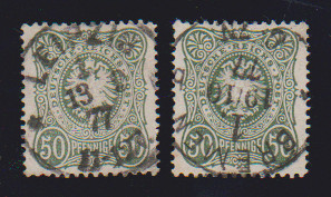 50 Pfge. dunkelolivgrün und mittelolivgrün, deutlich unterschiedliche Nuancen je zentrisch gestempelt, sign. Jäschke-L. bzw. Wiegand. Mi. 400,-
