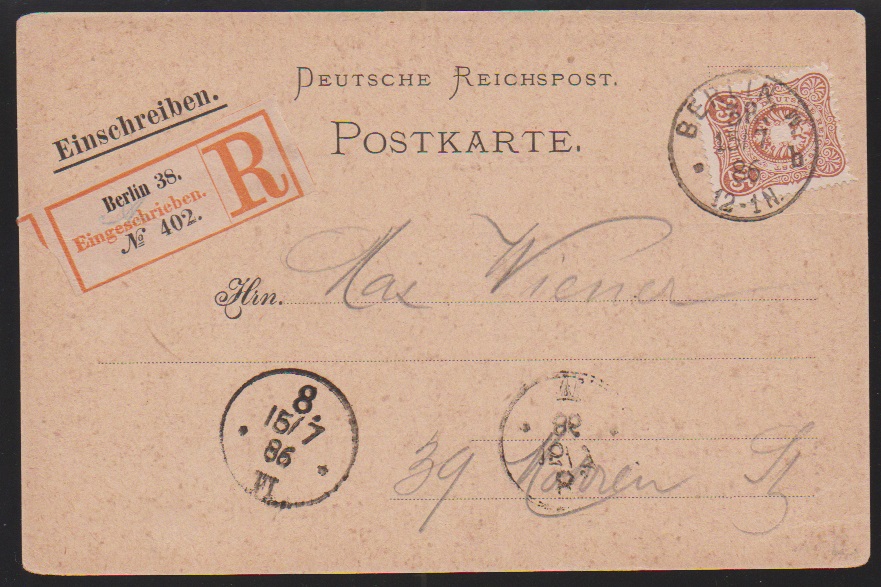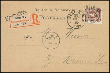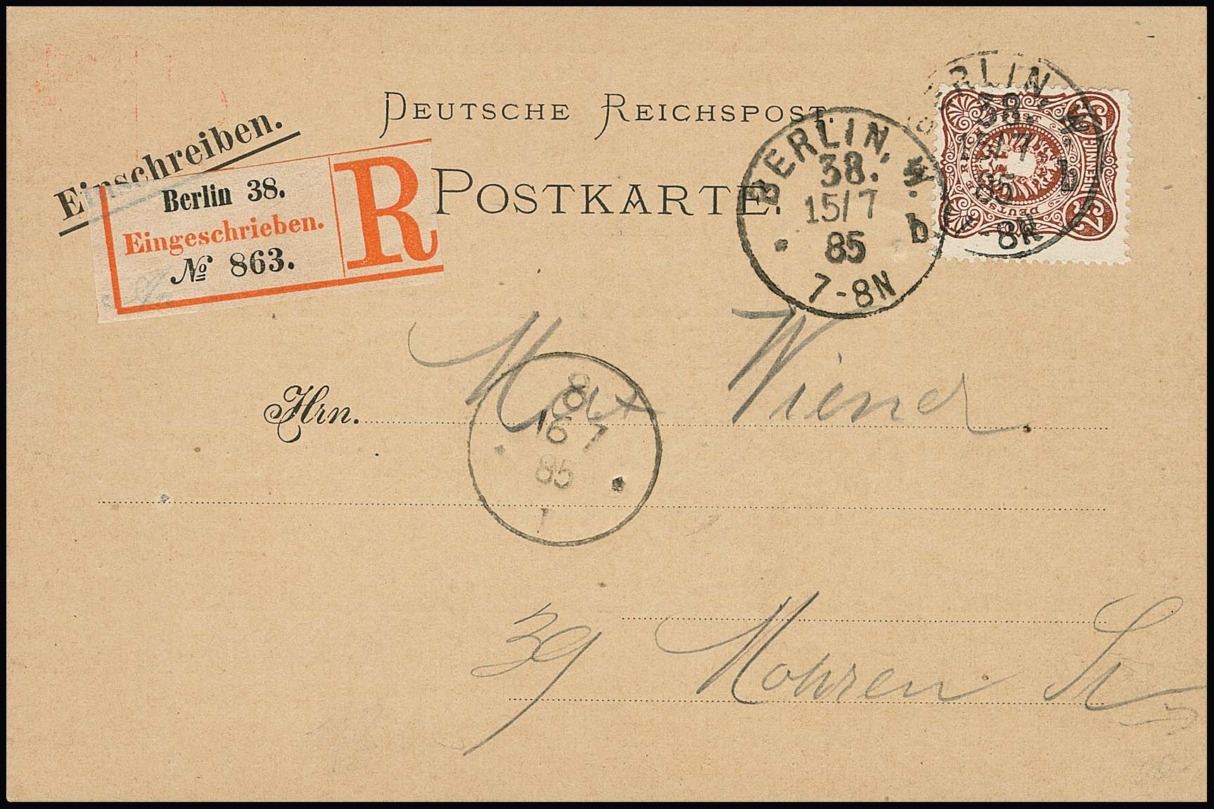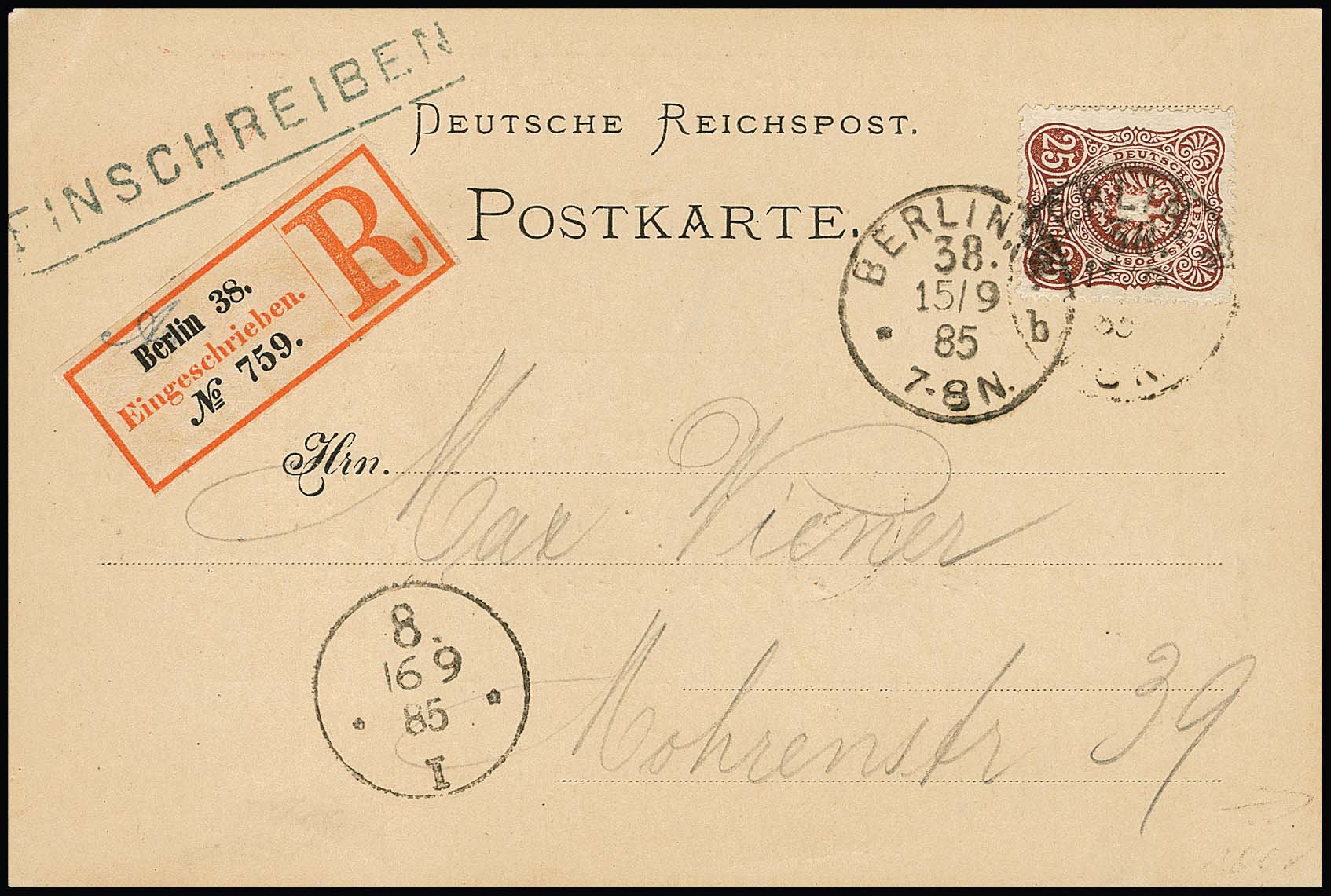 25 Pfg. orange- bis rötlichbraun, drei eingeschriebene Berliner Orts-Postkarten je mit Einzelfrankaturen in unterschiedlichen Nuancen, alles Drucksachenkarten mit Aktienbestellungen aus gleicher Korrespondenz 1885/86 in die Berliner Mohrenstraße