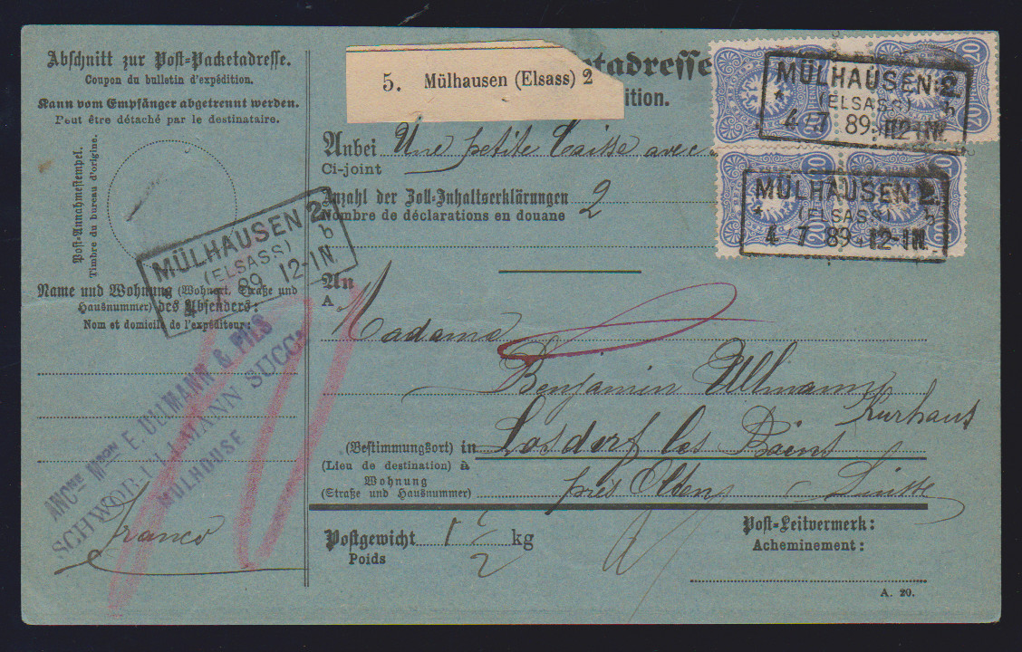 20 Pfge. dunkelultramarin, zwei Paare, davon eines als Zwischenstegpaar, auf Auslandspaketkarte von Mülhausen/Els. 1889 in die Schweiz, sign. Wiegand (Karte typ. leichter Mittelbug)