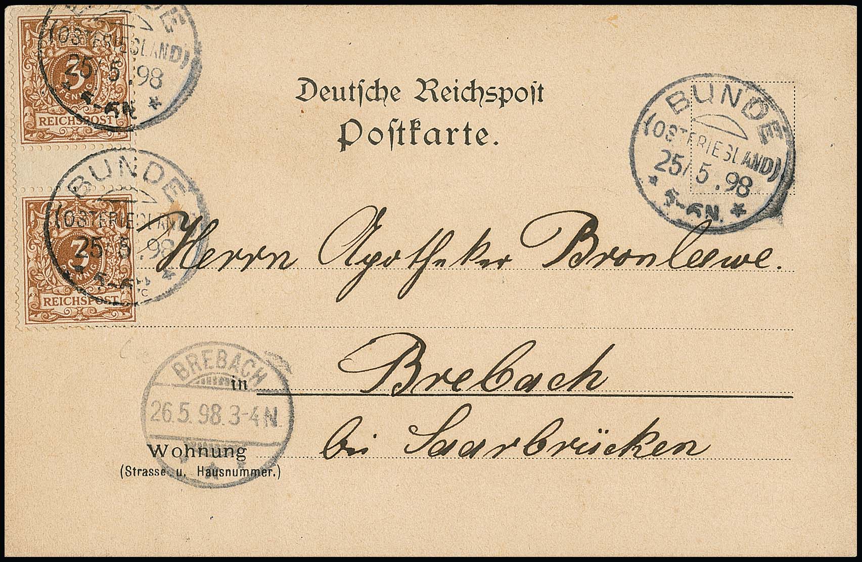 3 Pfg. gelbbraun im senkrechten Zwischenstagpaar auf früher Ansichtskarte ("Gruss aus Bunde") aus Bunde/Ostfriesland 1898, untere Marke gering verkürzte Zähne, gut sign. Zenker. Mi. 400,-