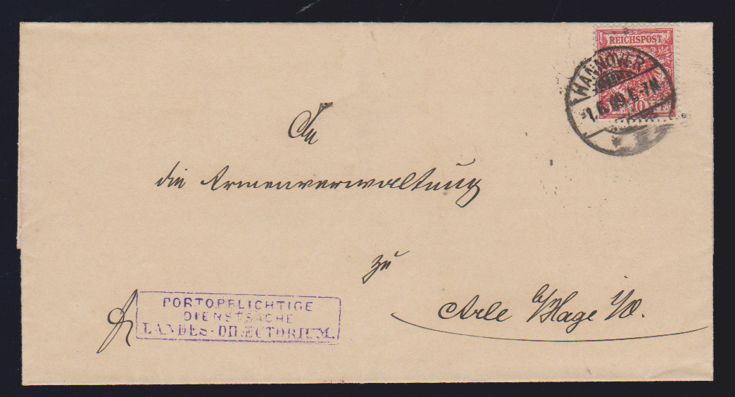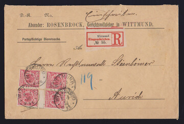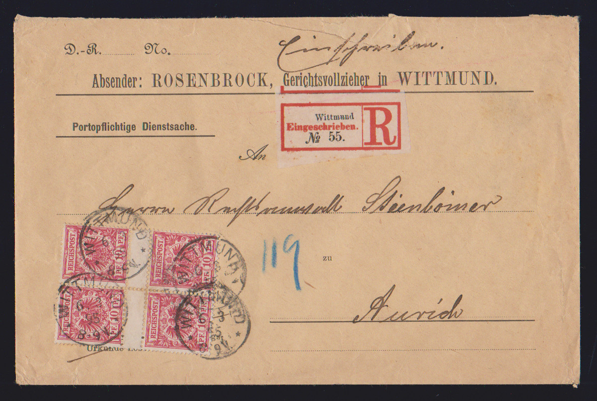 10 Pfg. im Viererblock mit zwei Zwischenstegpaaren auf Einschreibe-Doppelbrief (leichte Gebrauchsspuren wie kleine Öffnungsmängel oben) von Wittmund 1895 nach Aurich
