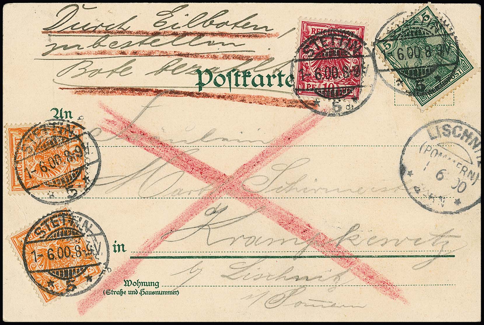 10 Pfg. rotkarmin nebst zweimal 25 Pfg. orange und Germania-Reichspost 5 Pfg. auf seltener Land-Expreß-Postkarte von Stettin nach Krampkewitz im Landbezirk von Lischwitz (5 + 60 Pfg. Landexpreß), sign. Zenker