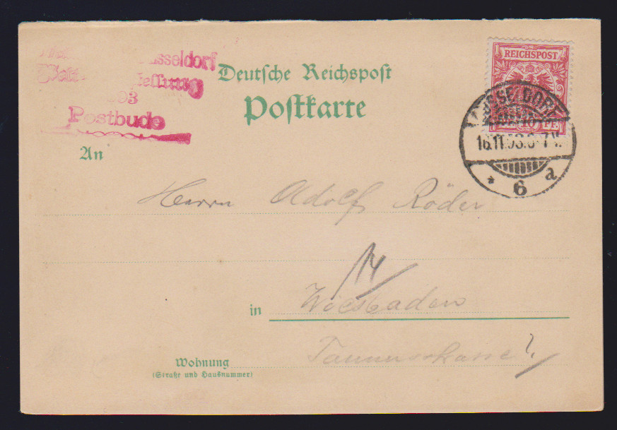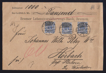 Drei bessere Belege: 10 Pfg. auf dekor. Doppel-Ansichtskarte aus Wiesbaden zum Briefporto, Nr. 47aa als EF (sign. Wiegand), sowie 20 Pfg. per drei auf Werbrief