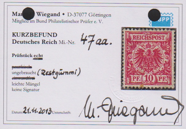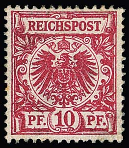 10 Pfg. lilakarmin, die seltene Erstauflage ungebraucht mit Resten des Originalgummis (min. Mgl. wie in die Zahnspitzen eingedrungener Gummi), Fotoexp. Wiegand. Mi. 1100,-