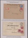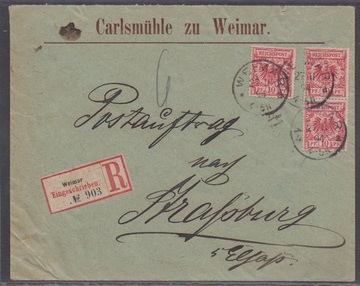 10 Pfg. per drei bzw. nebst 20 Pfg., auf zwei R-Postaufträgen, sowie per drei inkl. Zwischenstegpaar auf Zustellurkunde, alle aus Weimar