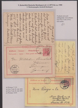 Krone-Adler-Ganzsachen-Doppelkarte 1895 von Weimar in die USA und von dort von New York zurück nach Weimar