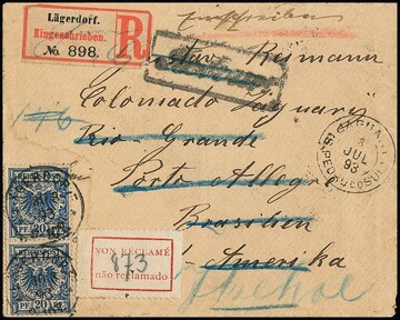 20 Pfg. blau per zwei auf Retour-R-Brief von Lägerdorf, 30.3.1893 nach Brasilien und retour, rückseitig acht Stempel, Laufzeit fünf Monate, leichte Spuren (Marken waren gelöst und sind nicht ganz exakt replatziert, gut sign. Zenker)