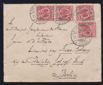 10 Pfg. per vier auf Bedarfsbrief 1898 von Steinau/Oder an das Kaiserl. Hofpostamt in Berlin zur Weiterleitung an einen Marine-Leutnant in Kiautschou, rs. mit K1 "Tsintanfort Marine-Feldpost"