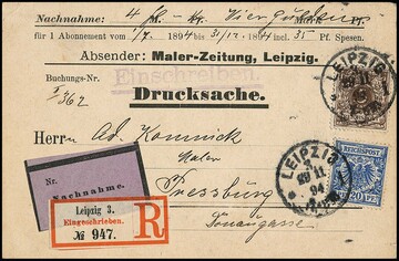 3 und 20 Pfg. auf ungewöhnlicher Einschreibe-Drucksachen-Nachnahmekarte der Maler-Zeitung Leipzig 1894 nach Ungarn
