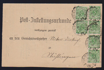 5 Pfg. grün per sechs (dabei Viererstreifen) auf Post-Zustellungsurkunde (leichte Gebrauchsspuren) aus Grimmelshofen 1891, sign. Wiegand