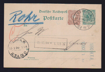 25 Pfg. auf Ganzsachenkarte 5 Pfg. Krone-Adler (typ. kl. Aktenspieß), gebraucht am 15.10.1890 als Rohrpost-Ortskarte Berlin