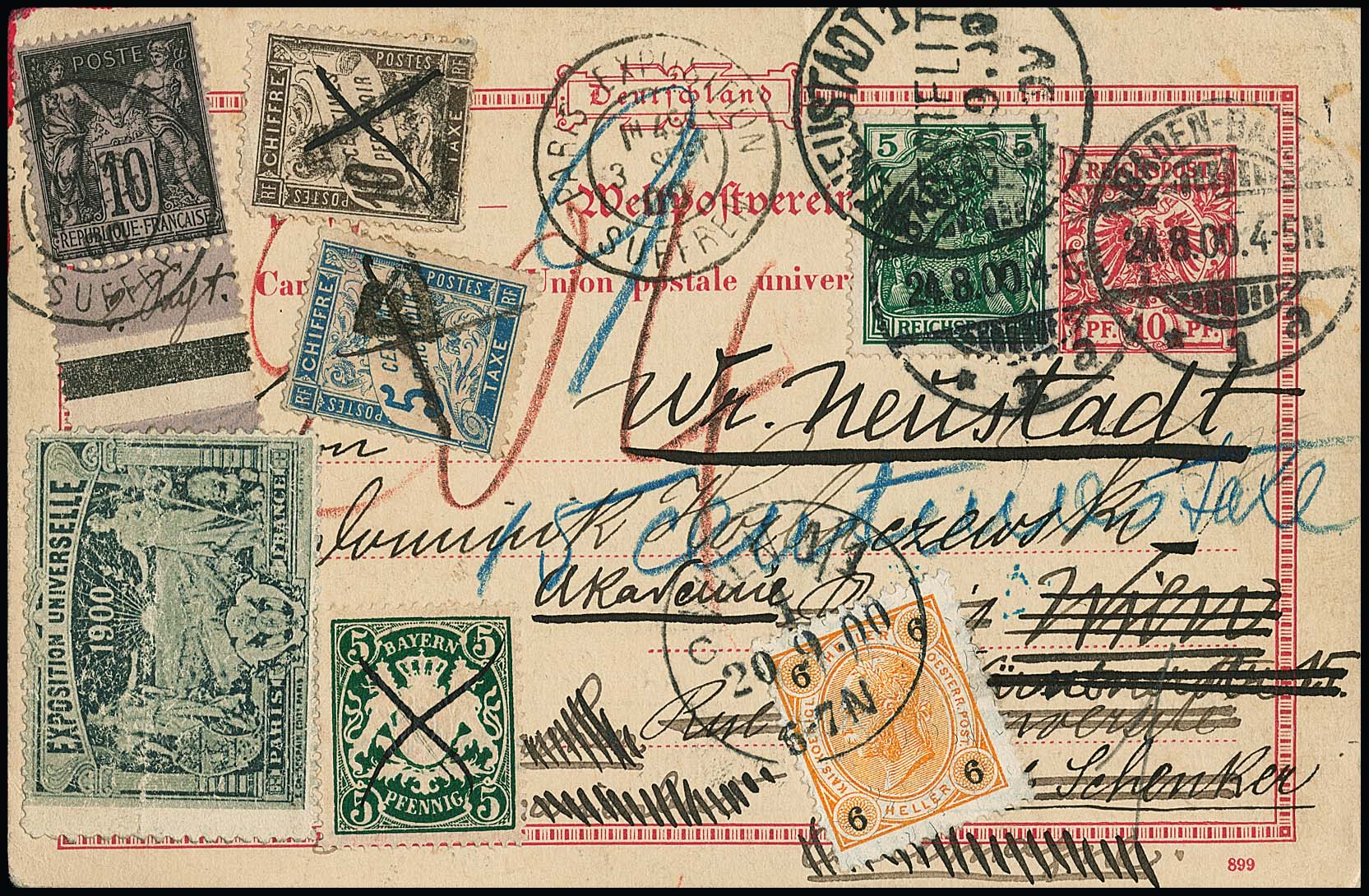 5 Pfg. Reichspost auf 10 Pfg.-Krone-Adler-Ganzsachenkarte von Baden-Baden 1900 mit vielfacher Nachsendung, u.a. nach Österreich und Frankreich mit entsprechenden Frei- und Portomarken, siehe Foto