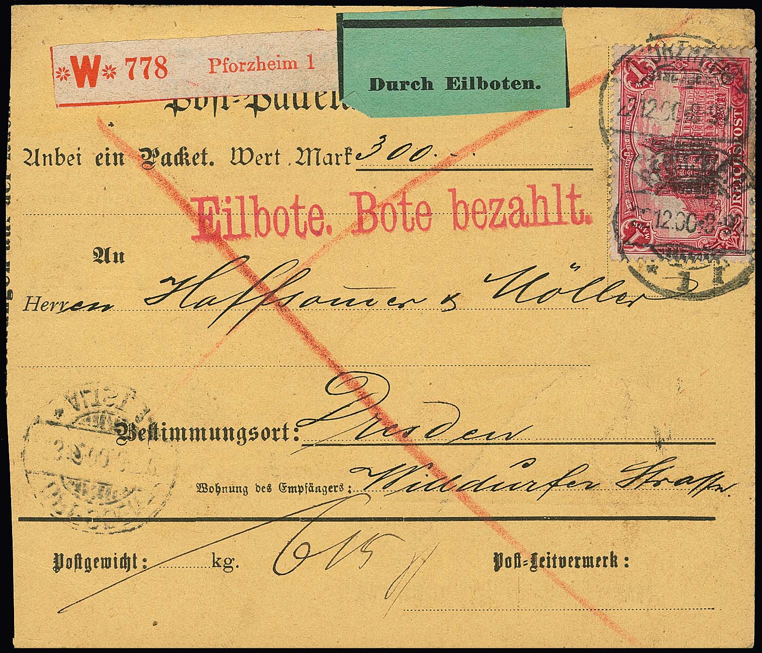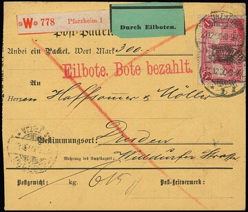 1 Mk. (unten etwas Randklebung und leichte Tönung) einzeln auf Expreß-Paketkarte von Pforzheim nach Dresden, seltene Versendungsform, Attest Kroschel. Mi. 750,-