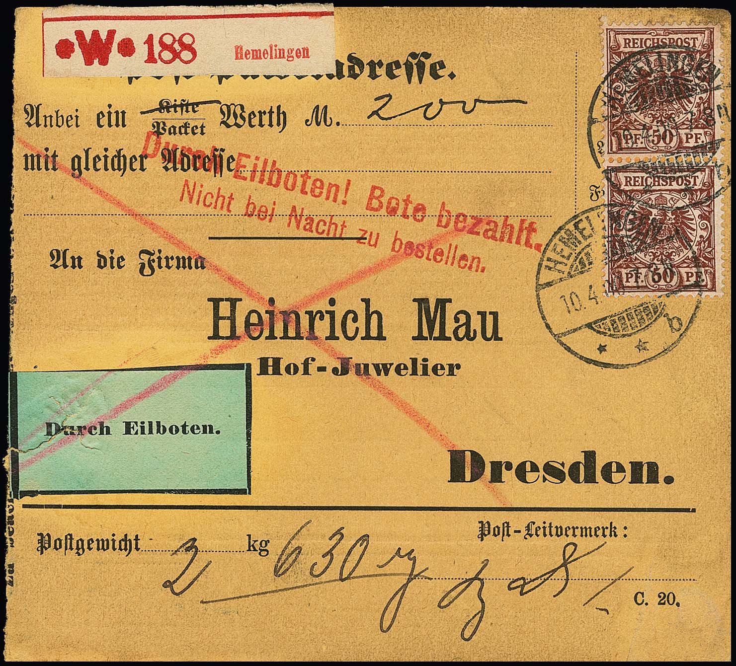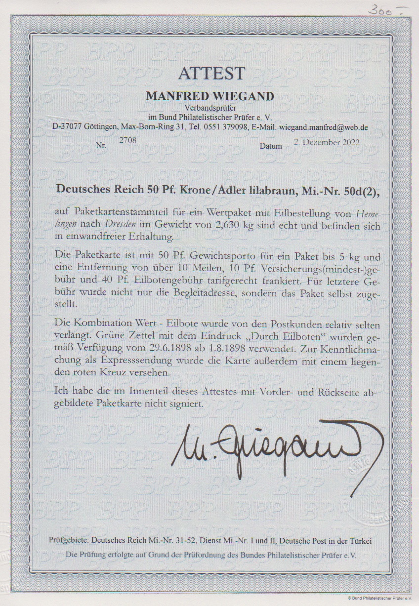 50 Pfg. lilabraun per zwei auf seltener Inlands-Expreß-Wertpaketkarte von Hemelingen nach Dresden 1898. Attest Wiegand "einwandfrei"