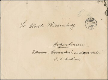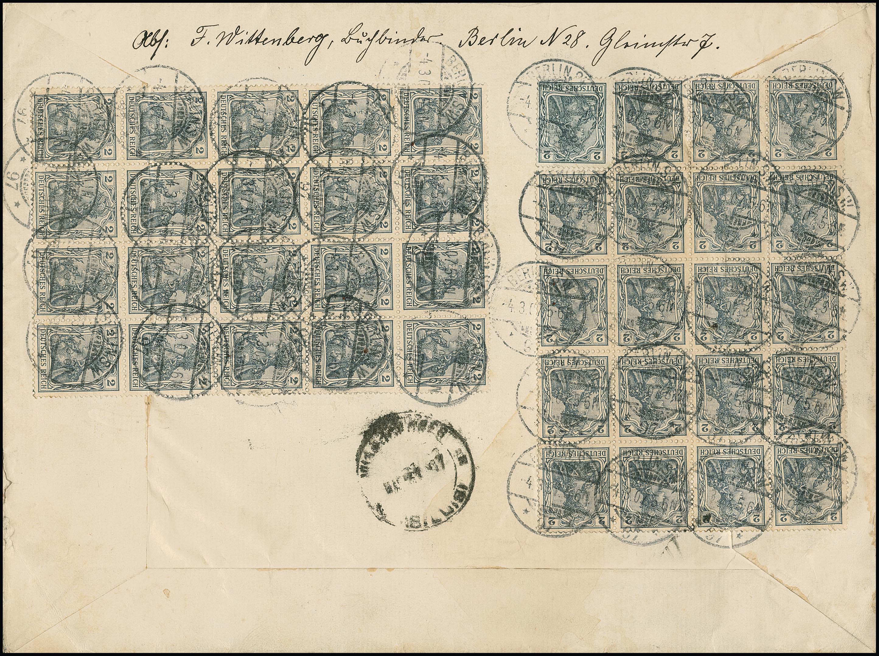 2 Pfg. grau per 40 (zwei 20er-Blöcke) als hohe Mehrfach-Frankatur rückseitig auf großform. Couvert von Berlin 1907 nach Argentinien