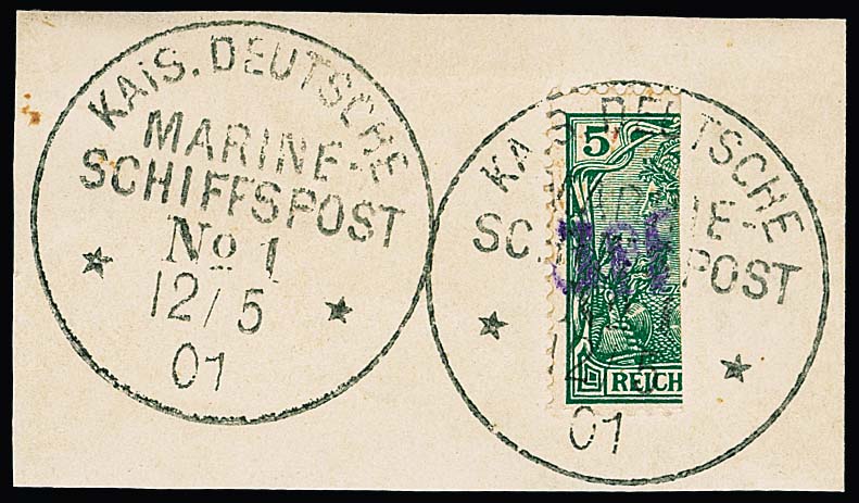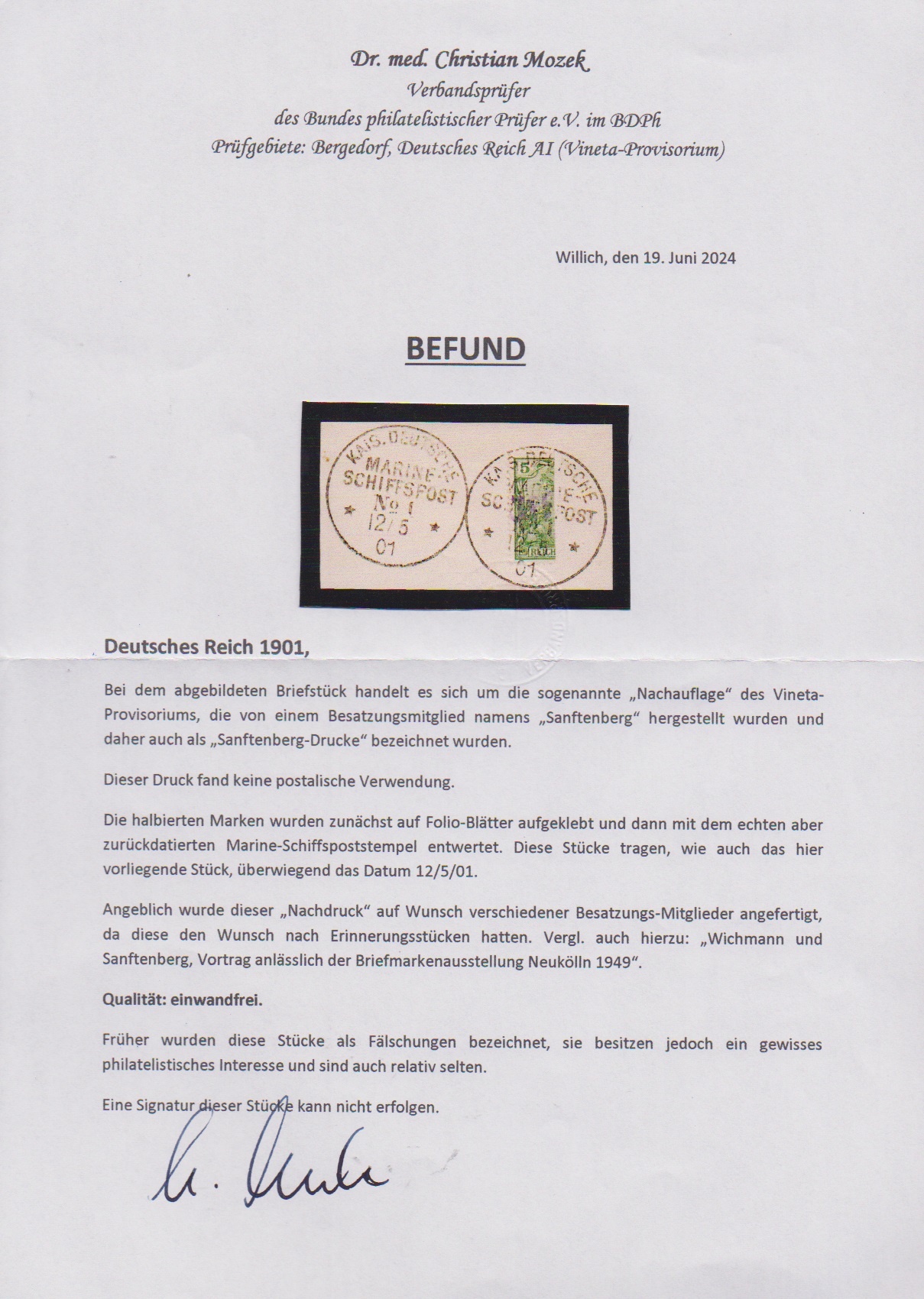 "Vineta-Provisorium", "3 PF" auf halbierter Germania 5 Pfg. auf Briefstück, Nachauflage des Vineta-Provisoriums, von einem Besatzungsmitglied namens Sanftenberg hergestellt und mit rückdatiertem Marine-Schiffspoststempel entwertet, literaturbekannt als "Sanftenberg-Druck" und "relativ selten", wie der Befund Dr. Mozek bestätigt