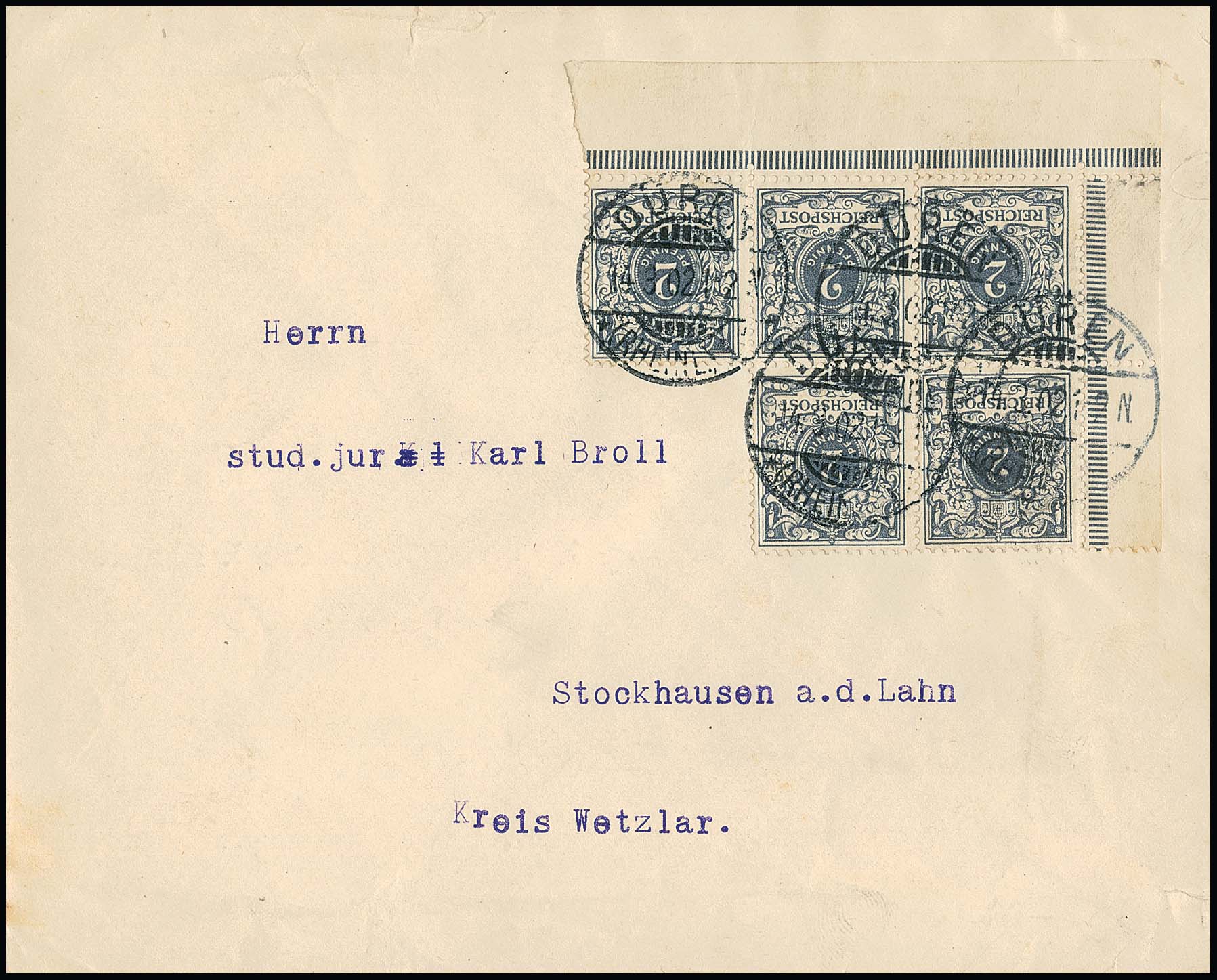 2 Pfg. im Fünferblock aus der linken unteren Bogenecke auf Bedarfsbrief aus Düren 1902, rs. hübscher Werbezudruck einer Mineralwasser-Firma