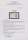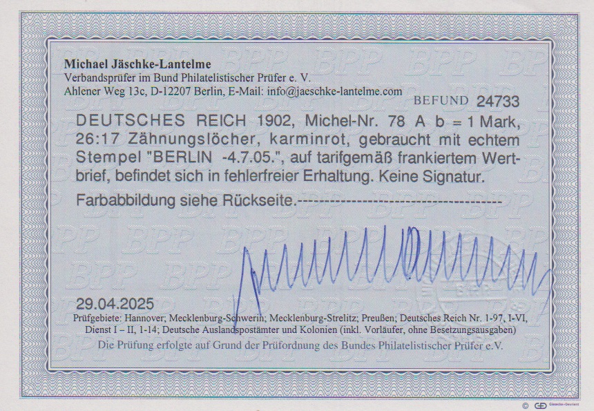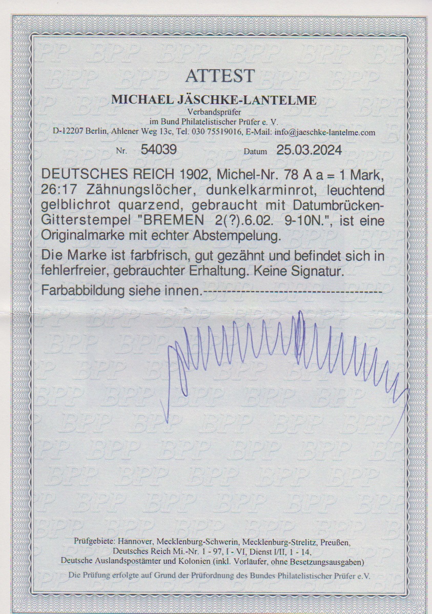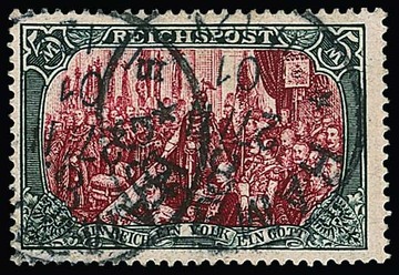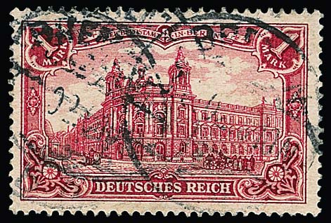1 Mk., gez. 26:17, gute Farbe dunkelkarminrot tadellos gestempelt, Attest Jäschke-L. Mi. 550,-