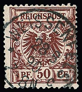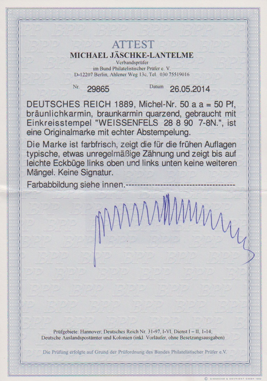 50 Pfg. feuerrot zentrisch gestempelt "Weissenfels 28.8.90", kleine und unbedeutende Eckbüge, Attest Jäschke-L. Mi. 1800,-