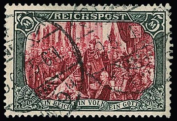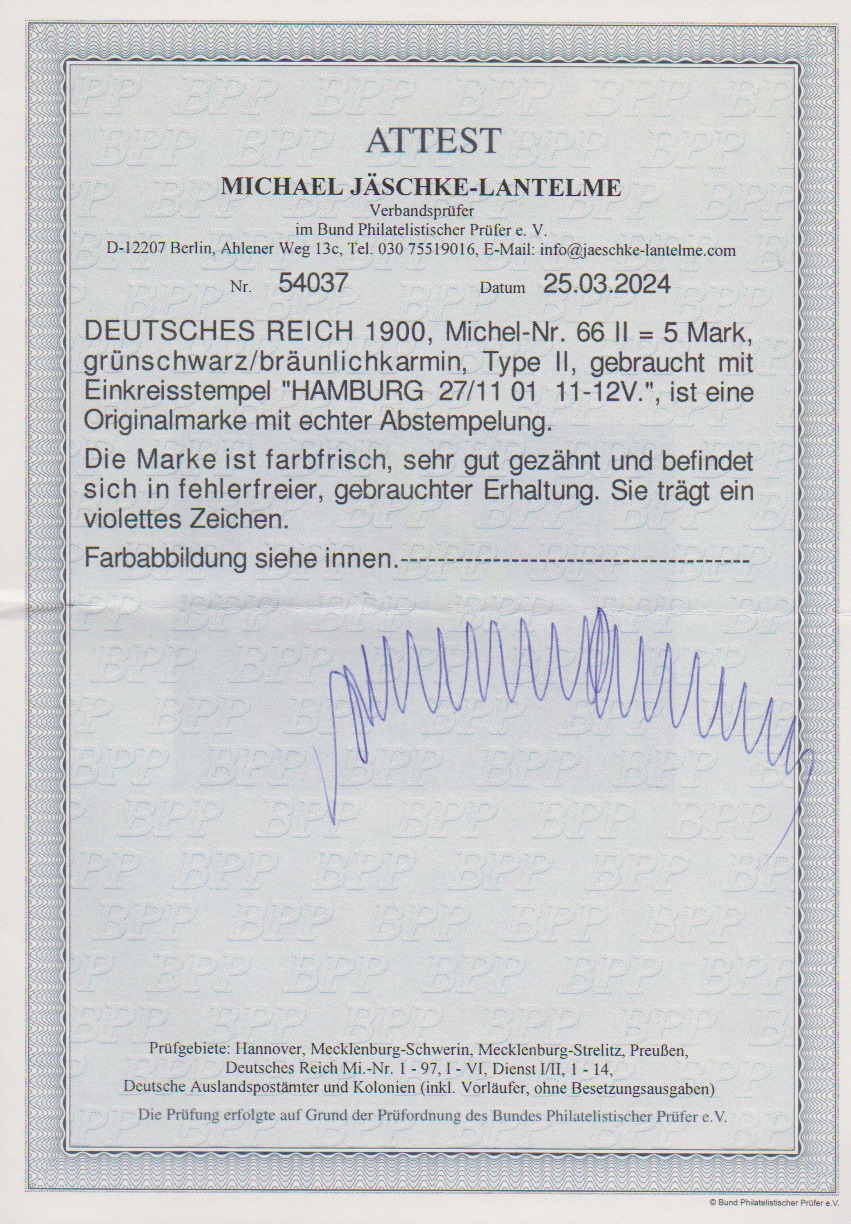 5 Mk. Reichspost in Type II tadellos gestempelt "Hamburg", Attest Jäschke-L. Mi. 500,-