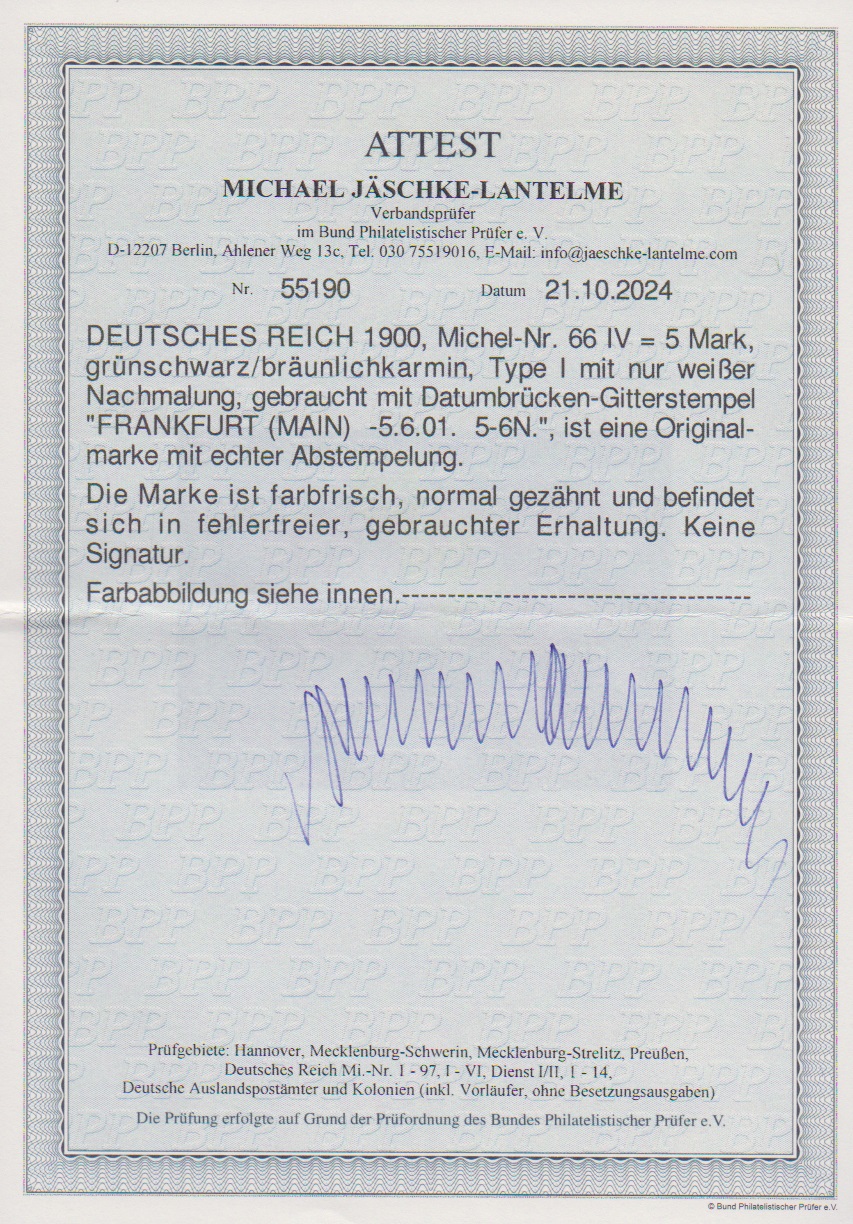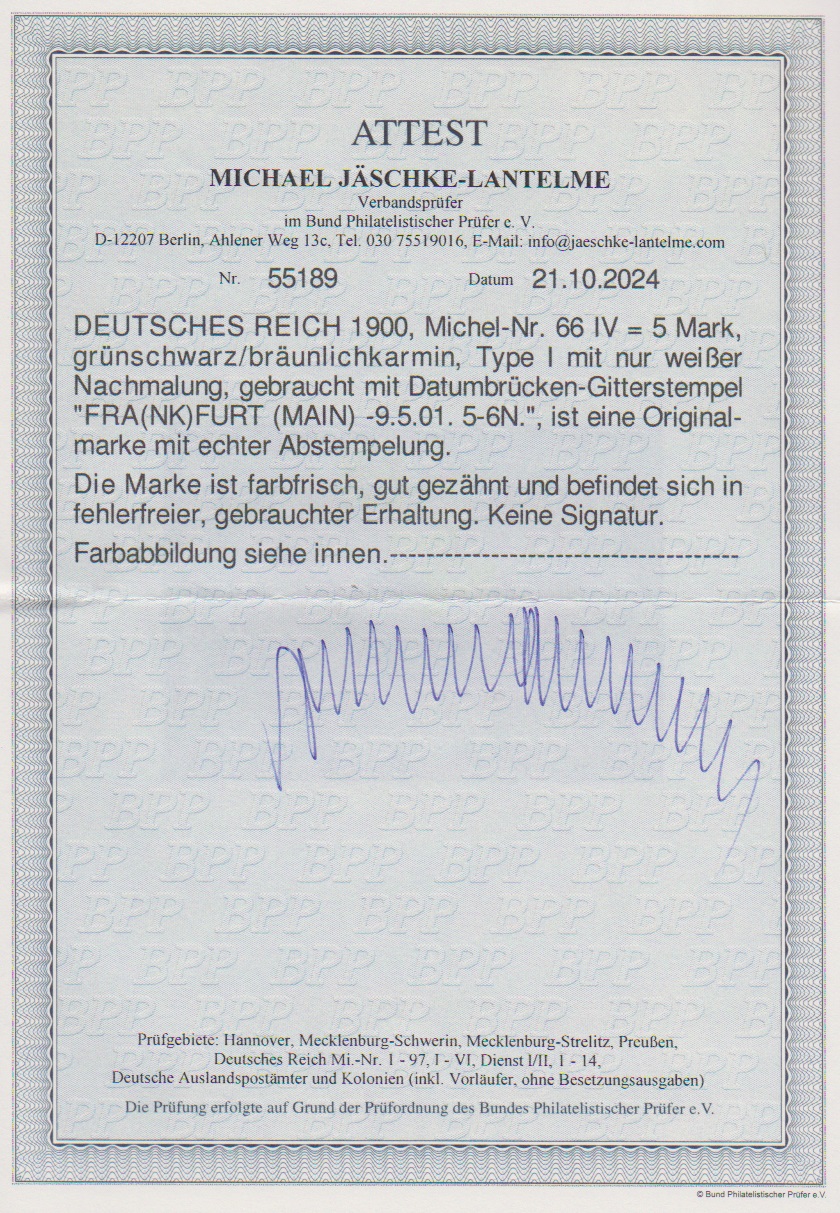 5 Mk. Reichspost in Type IV tadellos gestempelt "Frankfurt (Main)", Attest Jäschke-L. Mi. 800,-