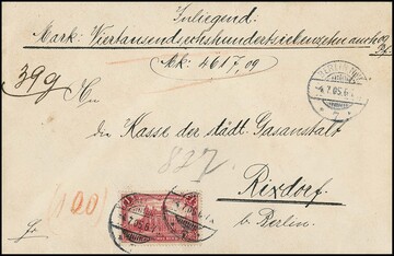 1 Mk., 26:17 Zahnlöcher, als gute Einzelfrankatur auf Ortsbereichs-Wertbrief von Berlin nach Rixdorf, Fotoexp. Jäschke-L.