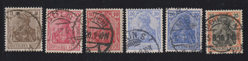 Germania, sechs bessere gestempelte Farben, alle geprüft, meist Jäschke-L.: Nr. 72b, 84IIb, 86IId/f, 87IIb und 88IIa. Mi. 930,-