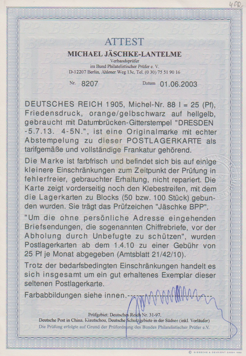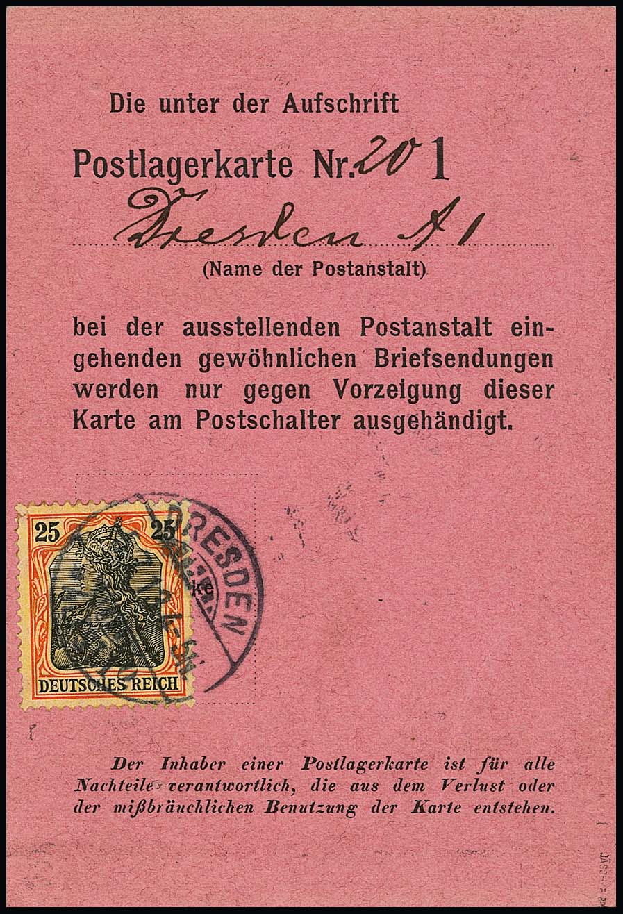 25 Pfg. Germania-Friedensdruck (kl. Zahnspalt bzw. kurzer Zahn) einzeln auf seltener Postlagerkarte aus Dresden 1913. Attest Jäschke-L.