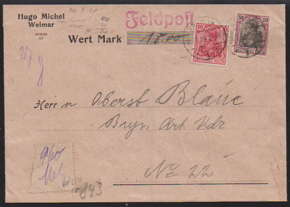 10 und 50 Pfg. Germania-Kriegsdruck auf Feldpost-Wertbrief (Couvert leichte Mittelfalte) von Hugo Michel/Weimar, 20.7.1918, an eine Feldpost-Adresse