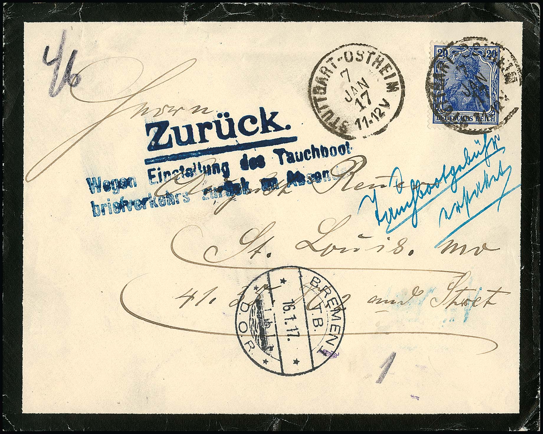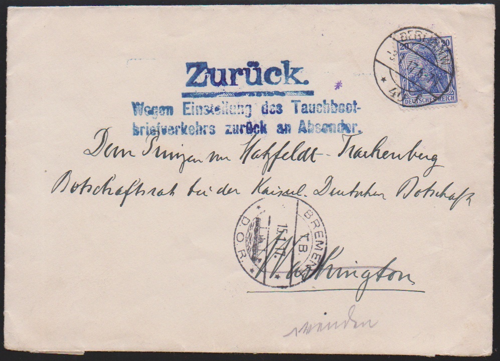 20 Pfg. Germania-Kriegsdruck, verschiedene Nuancen (einmal etwas "eckrund") je einzeln auf zwei Tauchboot-Briefen, von Berlin, 3.1.17, und Stuttgart-Ostheim, 7.1.17, je in die USA mit L3 "Zurück Wegen Einstellung des Tauchbootbriefverkehrs ..."