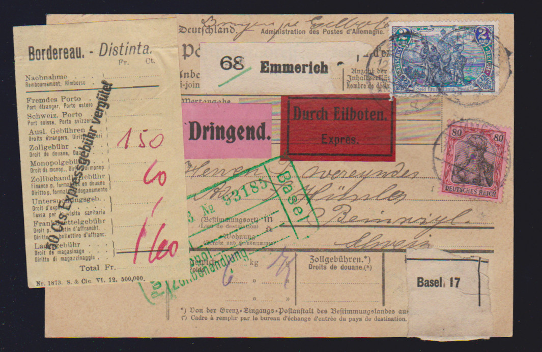 3 Mk. Kriegsdruck, B-Zähnung, als EF auf Paketkarte 1921, sowie 2 Mk. Friedensdruck, nebst 80 Pfg., auf Auslands-Expreß-Paketkarte 1913 (sign. Jäschke-L.)