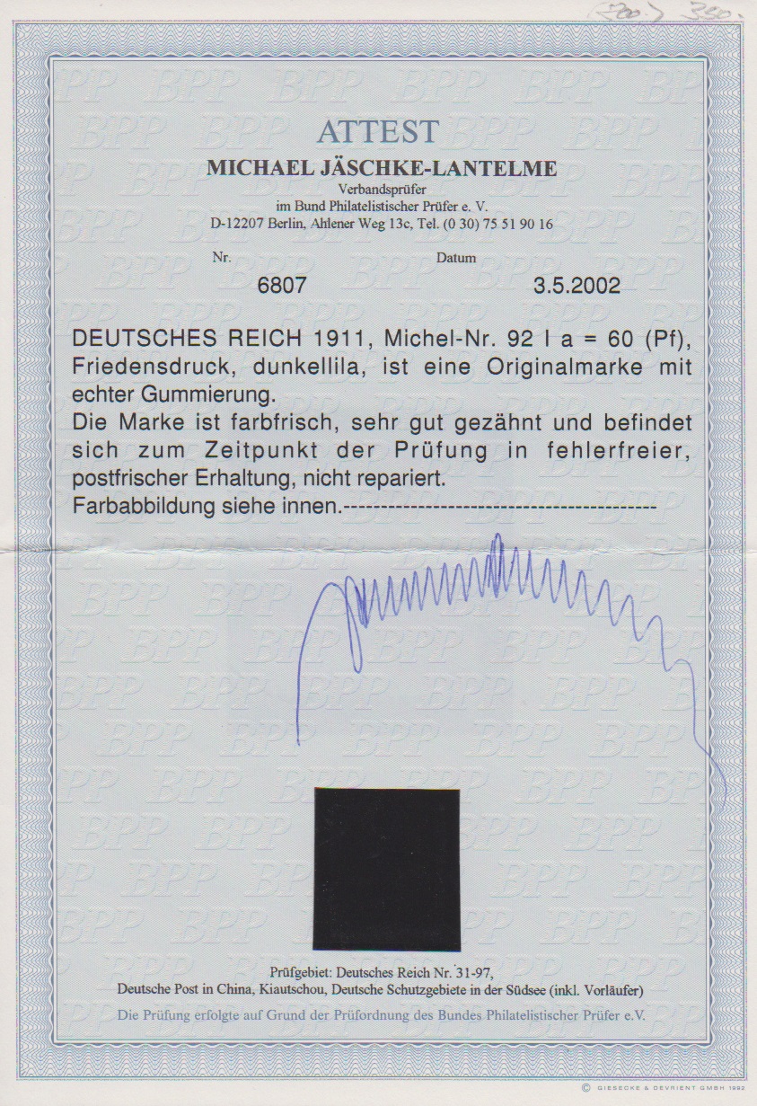 60 Pfg. Friedensdruck tadellos postfrisch, Attest Jäschke-L. Mi. 800,-