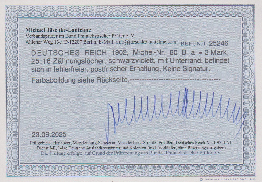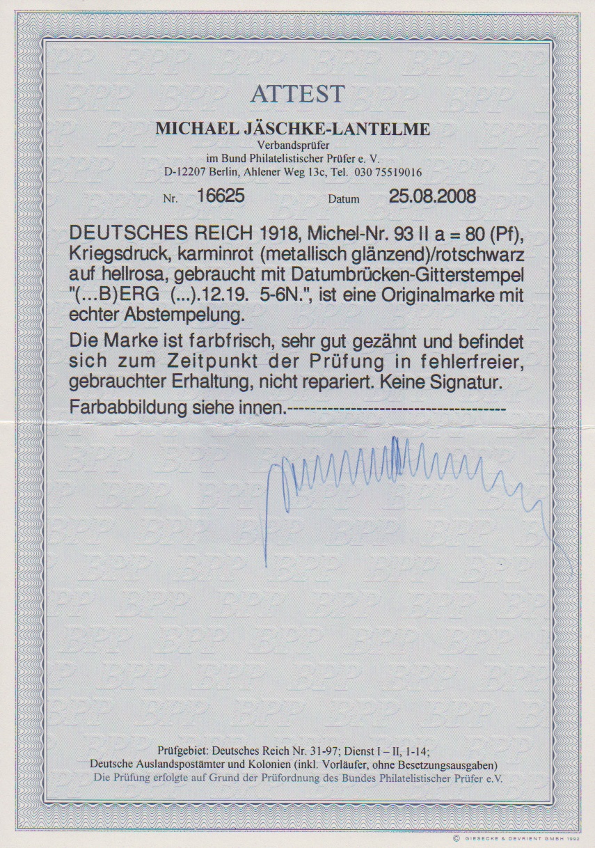 80 Pfg. Kriegsdruck, metall. glänzend tadellos gestempelt, Attest Jäschke-L. Mi. 1300,-