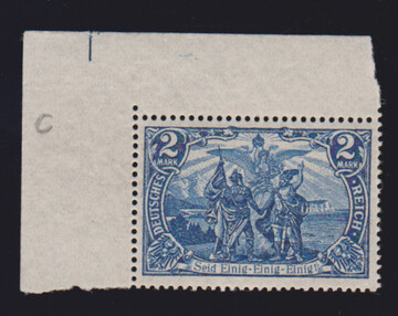 2 Mk. schwarzviolettblau, Kriegsdruck, als postfrische linke obere Bogenecke, sign. Jäschke. Mi. 180,- +