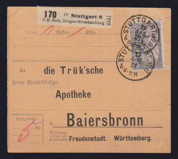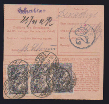 3 Mk. Germania-Kriegsdruck, B-Zähnung, senkrechter Dreierstreifen rückseitig als MeF auf NN-Paketkarte aus Dresden 1920