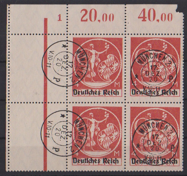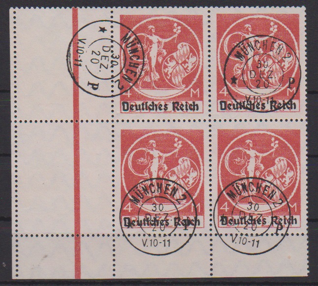 4 Mk. Bayern-Abschied, drei verschiedene gestempelte Bogenecken-Viererblöcke links oben und unten je mit Leerfeldern, sowie rechts unten, je mit Plattennummer. Mi. 250,- + Leerfeld und zwei Pl.-Nr.