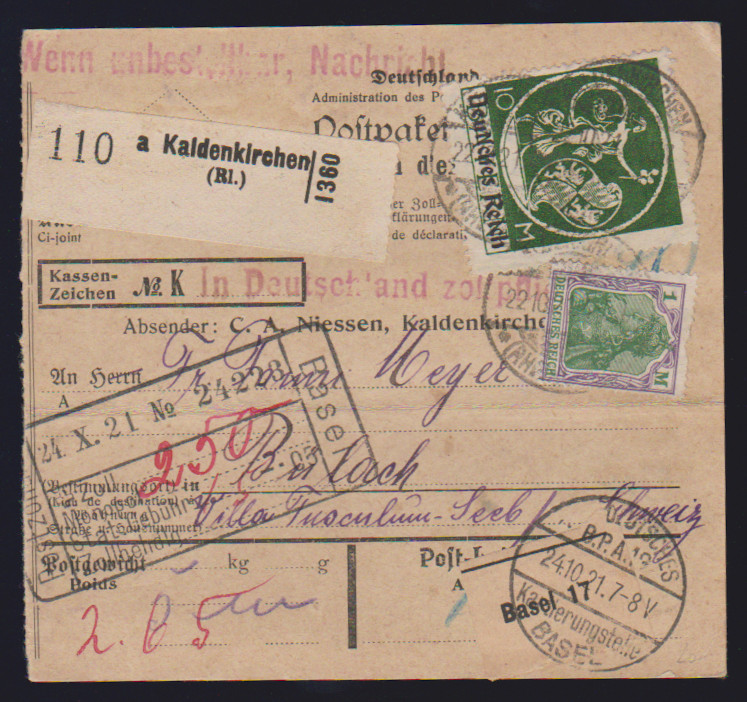 10 Mk. Bayern-Abschied in Type I mit Plattenfehler IV (Mi. 350,-), nebst Nr. 115e(2), 149aII(3) und 150 auf gefalteter Paketkarte aus Kaldenkirchen, sign. Fleiner