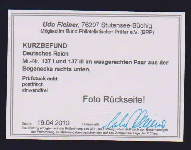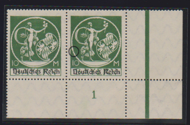 10 Mk. Bayern-Abschied, Type I, einzeln mit Plattenfehler IV, sowie im Eckrandpaar re.u. mit PF III, je postfrisch, jeweils Fotoexp. Fleiner. Mi. 350,-