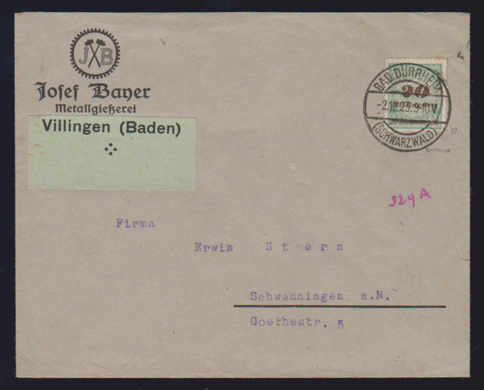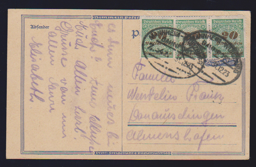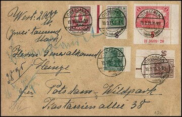 Vier bessere Infla-Belege: Nr. 116 rechte untere HAN-Ecke, nebst zweimal Nr. 92II (eine Ecke li. unten) und 142; ferner Nr. 191 als MeF per 20, 329A als MeF per drei im späten Aufbrauch 31.12.23, sowie Nr. 329AW als EF im Aufbrauch 2.12.23, sign. Infla
