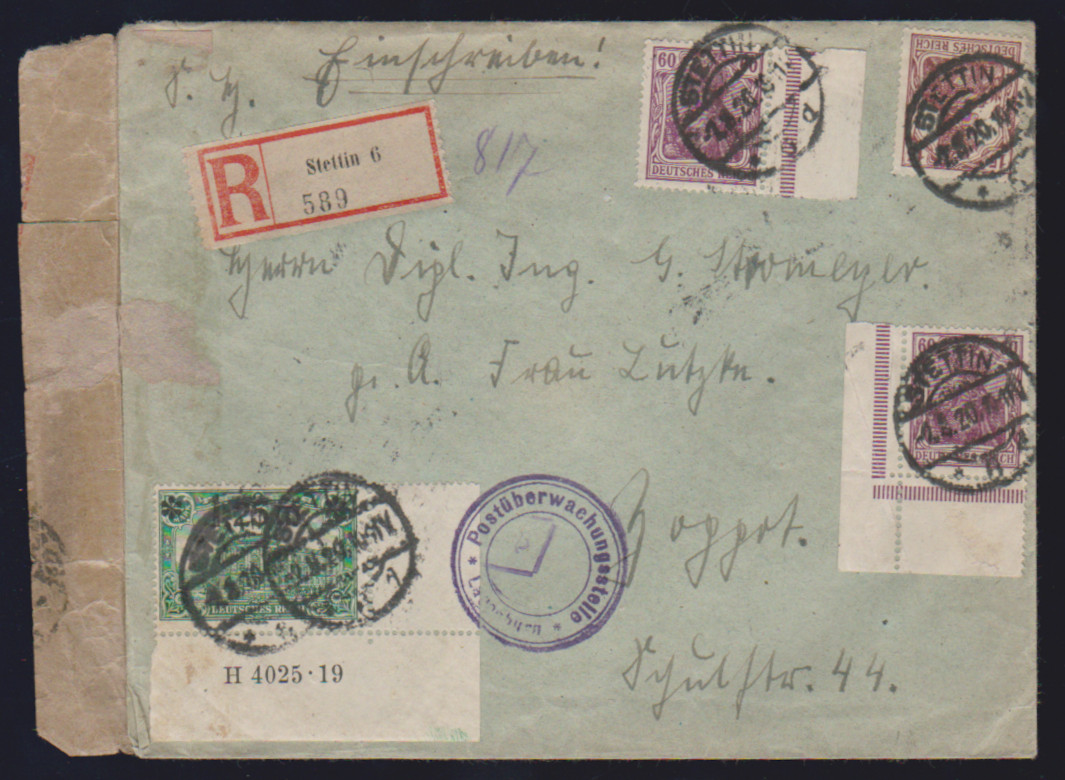 1 Mk., rechte untere Bogenecke mit Hausauftrags-Nr. "3409.20", nebst 5 Pfg. Germania in dunkelgrün (unten Randtönung) und braun (aus der linken unteren Bogenecke), sowie 4 Mk. und 1 Mk. Bayern-Abschied, auf portoger. Wertbrief (2. Gewichtsstufe) aus Ossecken